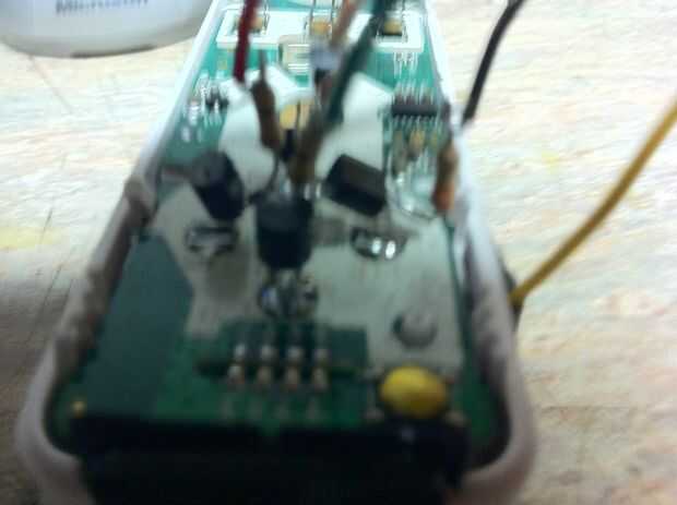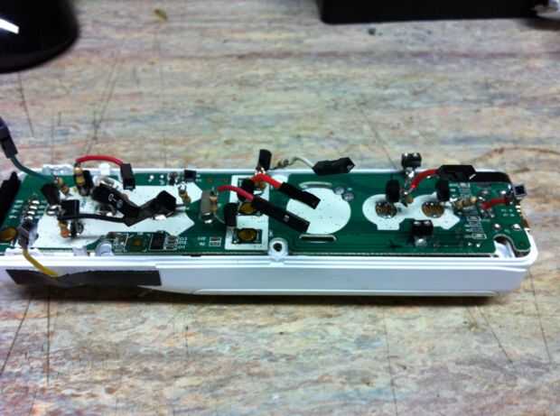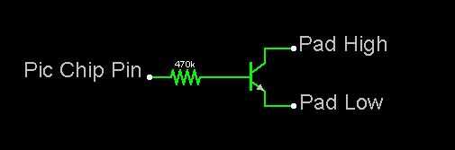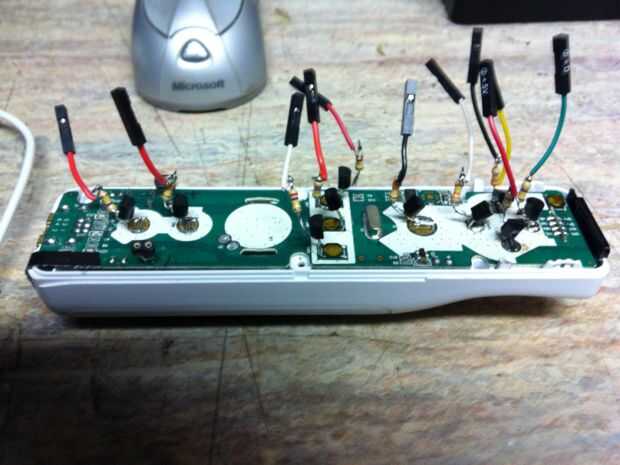 El pin del colector irá a la almohadilla de alto voltaje y el pin de emisor a otro. El pin de la Base se conecta a la resistencia k 470 que luego va a la viruta de pic. Cómo usted alambre para arriba depende de usted. Me parece que si bien puede parecer un poco descuidado, suelda los transistores y resistores directamente al wiimote permite su tablero de pan tiene forma menos cables sucediendo y ayuda a mantener el cableado muy claro. Manera menos mover cables alrededor si tratas de hacerlo con diferentes chips Pic y. Haciéndolo de esta manera Pin "*" va directamente al botón "*". Simple.