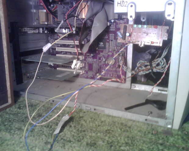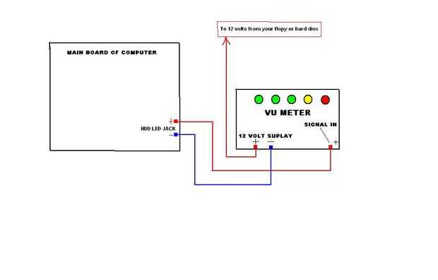 el vumeter es suplaying por 12v de tu flopy o medida de unidad difícilmente dis voltios antes de conect para el vumeter, solamente positivo cable de 12v conect en el vumeter, suelo conect de hddled y hdd led tiene cable positivo y negativo, positivo de hddled de bord principal conect a señal en + y negativo cable del hddled se conect a tierra suplay de vumeter igual en imagen