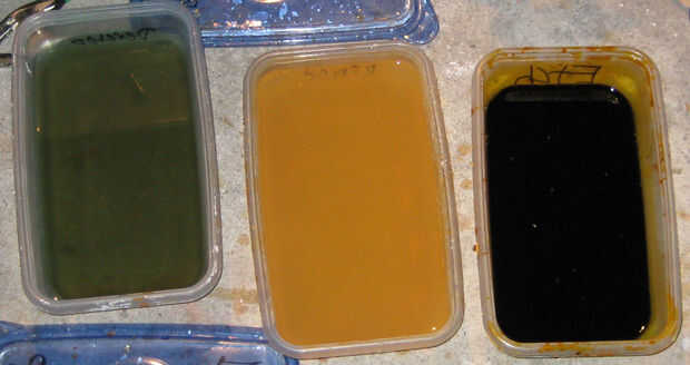 Ahora es necesario utilizar un poco química. Una vez que el PCB ha sido expuesto, apague la UV luz y preparar los tres productos químicos que necesitará. El agente de desarrollo con la cantidad de agua prescrito en la botella y el lugar de la mezcla en un recipiente de plástico grande para mentir el PCB plano en. A continuación, rellenar un similar tamaño con agua y llenar otro recipiente idéntico con cloruro férrico o grabador de cobre similar. Asegúrese de que el envase en que se coloque el grabador se hace de plástico, cobre grabadores y especialmente el cloruro férrico son más bien aficionado a comer a través de cualquier metal que entren en contacto con. En el cuadro principal se muestra a continuación, el líquido azul es el agente en desarrollo (iniciado claro) el fluido naranja es la etapa de enjuague, y el líquido marrón muy oscuro es el cloruro férrico.