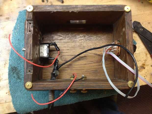 Usé alambre ribbin en el circuito de LED que tiene un tamaño muy bien para el cableado de circuito flexible y apropiado para sistemas de bajo voltaje LED. Note que muestran la parte trasera de la caja con solamente los canales izquierdos y derecho, pero no el conector de tierra (neg). No ha sido instalado todavía.