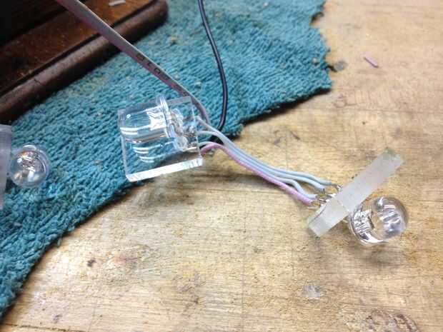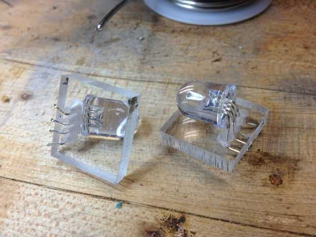 Usé 10mm RGB LED para la iluminación interior. Para fijar los leds uso del plexiglás con agujeros perforados en él para mantener el cuadrado de puntas y poder montarlos dentro con pegamento caliente del derretimiento y no empañar la lente.