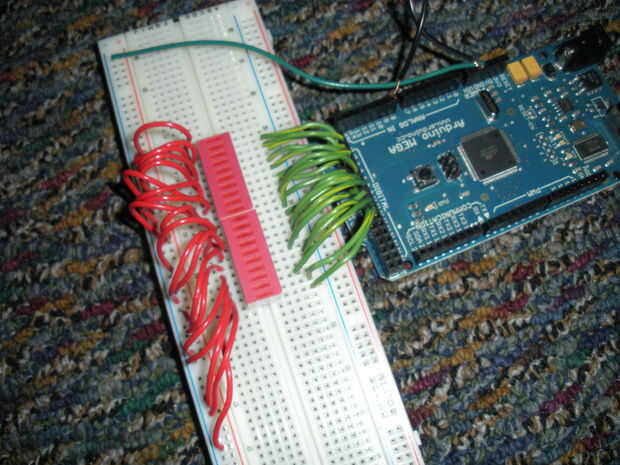 A continuación, ya que los cables estén conectados horizontalmente en breadboards, inserte veinte 20 puente cables en los enchufes de la protoboard que son horizontales donde la negativa (para los gráficos de la barra allí no es ningún predesignada lado positivo o negativo, puedes elegir) enchufe de puntas de los gráficos de barras en la protoboard. Luego tomar cada uno de los cables de puente y conectar al bus negativo de la placa en ese mismo lado.