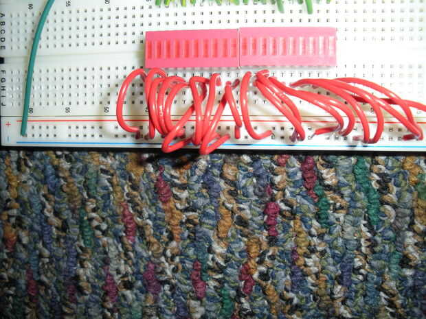 Ahora, inserte los cables de puente de 20 veinte en el enchufe de la placa al igual que en el paso anterior excepto que esta vez insertarlos en el lado positivo de las gráficas de barra. No conecte los cables de puente al bus de la placa positivo.