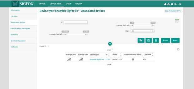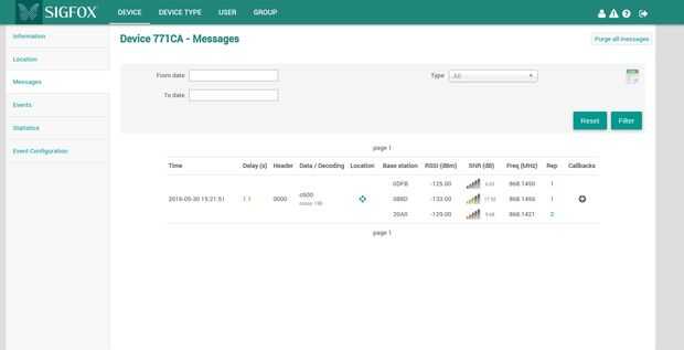 Haga clic en "Dispositivos" -> dispositivo ID -> mensajes para ver los mensajes recibidos por la red de Sigfox