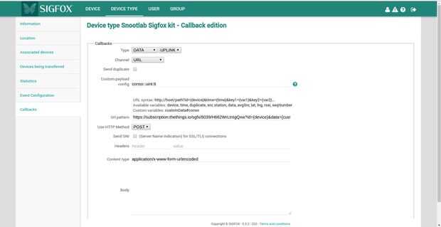 Sigfox ofrece un servicio de devolución de llamada: cada vez que se recibe un mensaje por la red, hemos creado la forma que queremos que sea remitido a nuestro servidor de aplicaciones. URL, tipo de contenido, solicite el cuerpo...