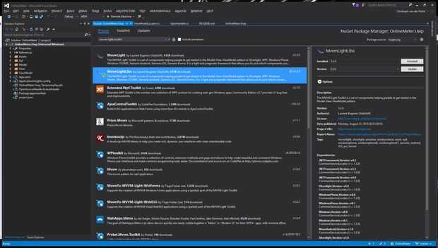 Vamos a necesitar algunas librerías externas que nos ayudará a implementar nuestro código. Click derecho sobre el proyecto y seleccione "administrar Nuget paquetes..." en el siguiente cuadro de diálogo introduzca "Luz MVVM Toolkit" en la barra de búsqueda e instalar el paquete de librerías como se muestra en la pantalla.