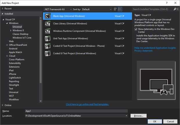 En primer lugar, seguir adelante y crear una nueva solución con una aplicación de UWP. Hacer así haga clic en archivo -> nuevo proyecto... En el siguiente cuadro de diálogo Seleccione el Windows Universal -> plantilla en blanco de la aplicación (Windows Universal). Visual studio ahora generar la solución y el proyecto de instalación.