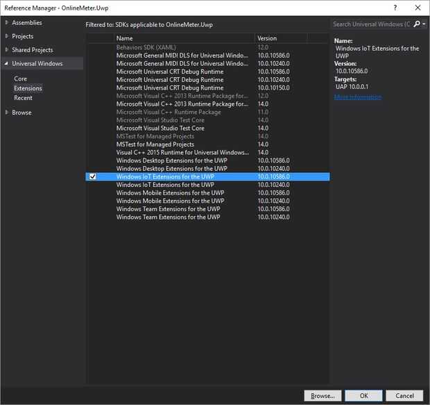A continuación necesitaremos las librerias para comunicarse con los pines GPIO de la Raspberry Pi. Microsoft ya ha proporcionado a nosotros con una biblioteca que nos ayudará a hacer esto. Haga clic derecho sobre la entrada de referencia en el proyecto y haga clic en "Agregar referencia...". Marque la casilla delante de la entrada "Windows IoT extensiones para el UWP" y haga clic en Aceptar. Ahora se hace referencia a los libs.