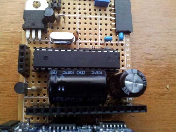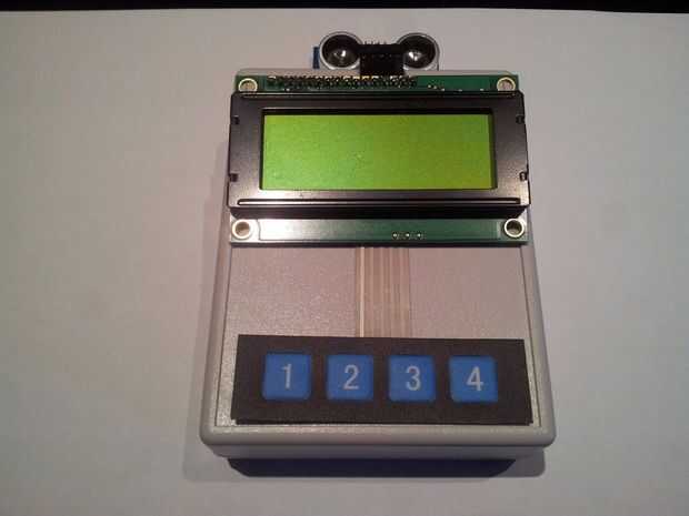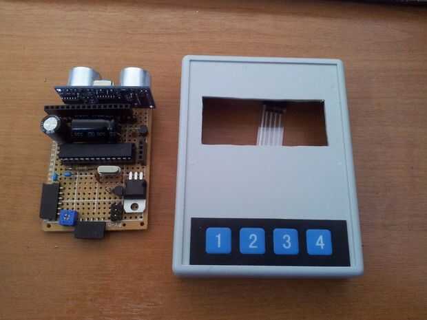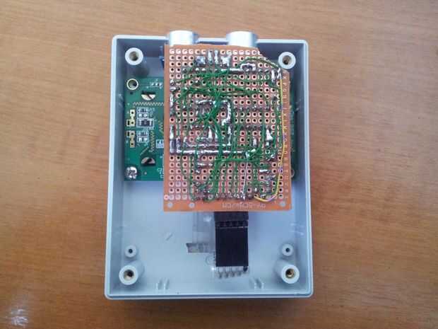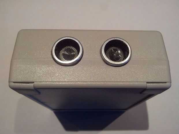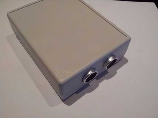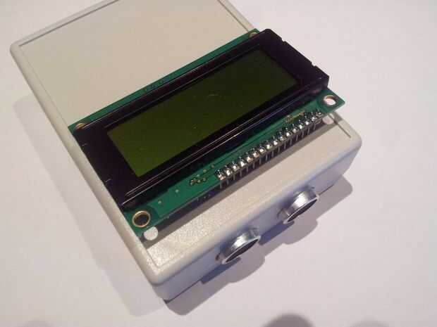Al principio, corte la pantalla LCD en el frente de la caja y luego los 2 agujeros de los transductores de ultrasonidos en el frente. La ubicación exacta de los orificios depende de cómo alguien construye la construcción. También tuve que abrir una rebanada en la parte inferior delantera para el cable de cinta de membrana. El resto de las piezas se ensamblaron un pcb con el objetivo de ángulo encabezados, por lo que el módulo de ultrasonidos podría tener un ángulo de 90 grados a la parte frontal del dispositivo.