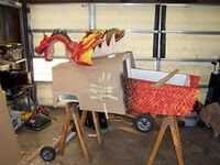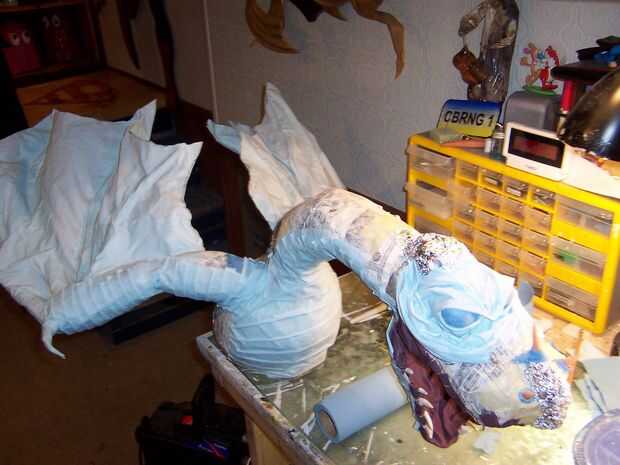 El dragón tendría que ser muy fuerte (mucho más fuerte que si sólo colgaría en la pared para la decoración). Por lo que fue fuertemente reforzado con alambre y papel maché. Para unir el dragón a la capota del coche que necesitaba crear un soporte de montaje. Corte la parte inferior del cuerpo del dragón y me inserta una sección de la madera. Esto fue reforzado con papel maché (que se seque tan duro como una roca en una semana). Esto me permitiría atornillar para arriba a través de la capilla del coche atado el dragón.