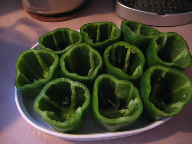 Para hacer fácil relleno Coloque los pimientos en posición vertical en cacerolas.