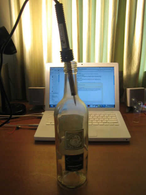 Puede poner algunas piedras o monedas dentro de la botella en caso de golpearlo. Tenga cuidado de que la parte superior que la mitad de la botella se calientan cuando se pone en el soldador así agarra la punta de abajo para moverlo.