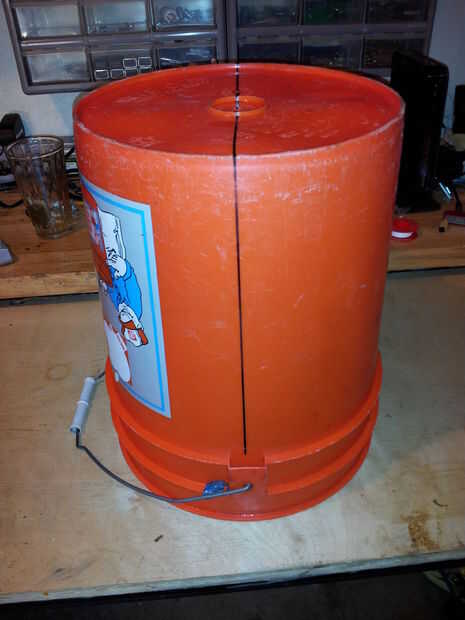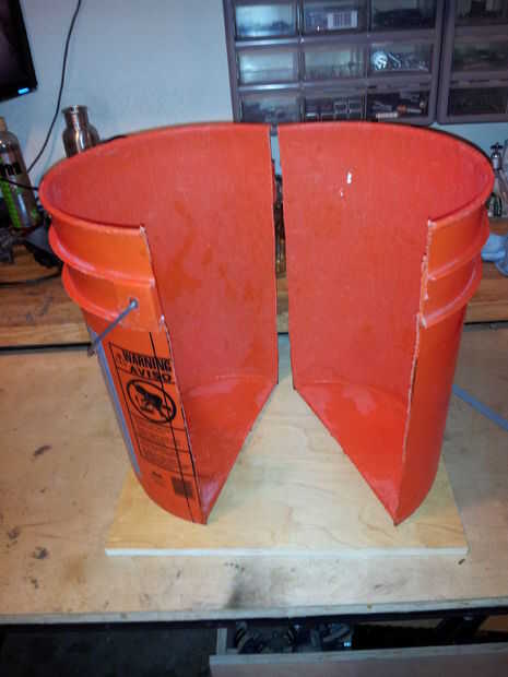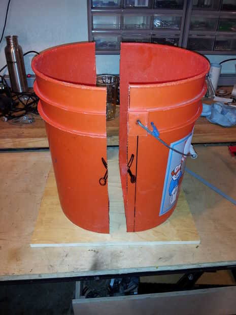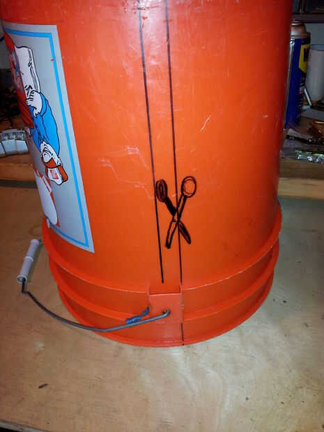 Dividido el cubo por la mitad para la referencia. Hacer otra línea pasado el titular de asa, que es donde se hace el corte. Utilicé una combinación de un cuchillo y una sierra de marquetería para cortar el cubo.
