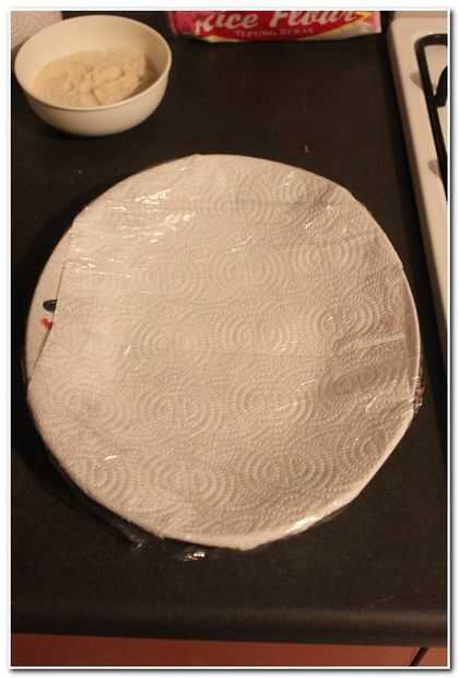 Antes de empezar, tome un pedazo de toalla de papel de cocina y colóquelo en el plato. Hice esto para ocultar los diseños en el plato que tengo. Poner se aferra abrigo en la parte superior para que usted no tiene que preocuparse de limpiar el plato más tarde. También ayuda a que la masa no se pegue en el plato, lo que es fácil para el moldeado