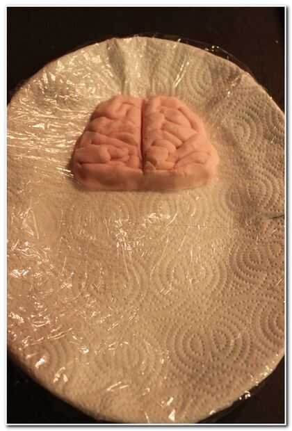 Amasar la harina del arroz mediante la adición de azúcar. Mantener un pedacito pequeño de la masa para los ojos a un lado. Mezclar un poco pequeña de colorante rojo para el resto de la masa a él para darle un color rosado. Tomar pequeños toques de harina y rodillo en una superficie plana para conseguir hacen tubos delgados. Empezar a colocar los tubos en una forma retorcida en la parte superior del plato. Colocar los tubos estos se asemejan a los dos lados del cerebro.