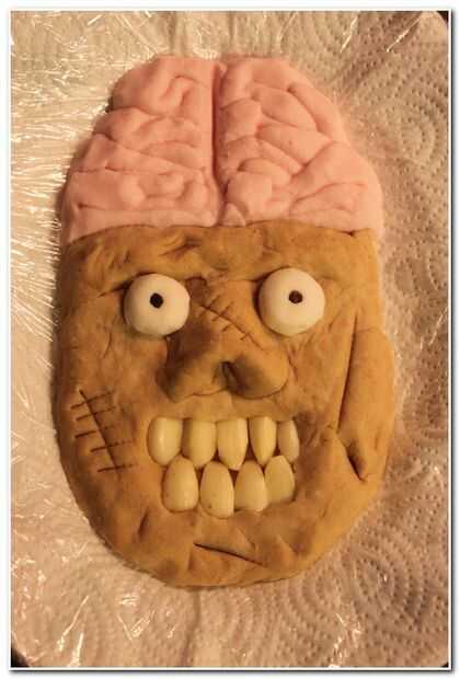 Coloque la pimienta entera en medio de los ojos. Cortar el blanco chocolate en pedazos largos y afilar los extremos. Colocar dentro de la depresión creada por la boca y empujarla un poco dentro en los lados superiores e inferiores de la boca