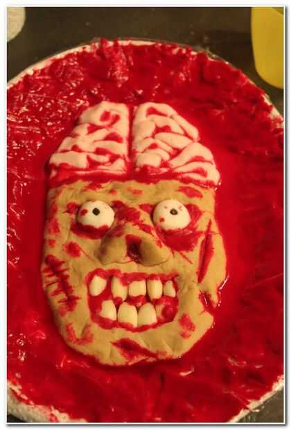 Pour la sangre se mezcla todo en la cara y la cabeza. También untar algo de él en el cerebro y otras partes de la cara. Vierta el resto de la mezcla en el plato y cubrir todos los lados para que se siente como si la cabeza está flotando en un charco de sangre.