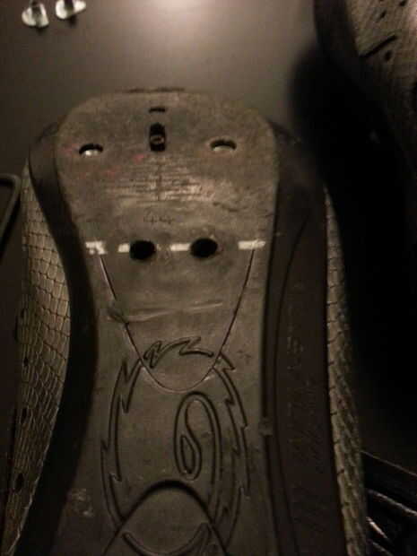 Este método funciona mejor con zapatos con suela plana, de plástico. Carbono está bien, pero deberás tener cuidado con la perforación. Zapatos con fondos planos son difíciles. Yo sugeriría tratando de llenar en los agujeros para tratar de crear una buena superficie plana para trabajar con. He encontrado un par de modelos de Sidi tienen un agradable fondo plano (mina son Sidi T2)