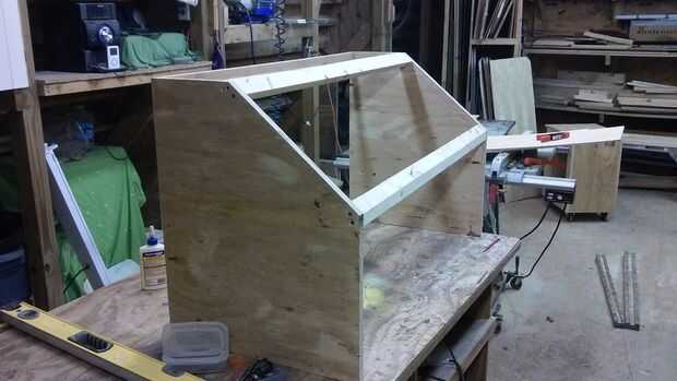 Comencé el proceso de ensamblado del gabinete ripeo ángulos de 2" x 2" tablas que emparejó los ángulos en los paneles de los extremos, luego atornillan con 1-5/8" tornillos de panel de yeso, asegúrese de perforar agujeros primero. Otra vez voy a añadir, antes no Ingeniero de este gabinete. No corte el extremo ángulos de panel a cualquier ángulo específico de que utiliza algo que se veía bien y proporcionan una cantidad abundante de visibilidad en el cuadro. Cuando arrancaron las placas, simplemente transferí los ángulos de los paneles al extremo a de 2 x 2, luego set con que vio el ángulo de la hoja en mi mesa para que coincida. Algunas cosas son simplemente más fáciles así, no hay necesidad de pensar más las cosas a veces.