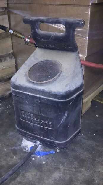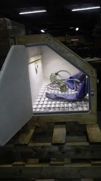 Primero había pintado el interior del gabinete con una cartilla de madera látex. Luego he utilizado masilla de látex para sellar a lo largo de todas las juntas y las costuras antes de aplicar la capa final de pintura. Yo soldado encima de una rejilla de piso de un montón de barras de acero de diámetro 3/16". Se basa en un par de bloques de madera de 1" en el extremo inferior del suelo inclinado, final de la puerta, para permitir la rejilla a nivel sobre el abrasivo que recoge. Perforé un orificio de 1" en el extremo opuesto de la caja para dar cabida a la manguera de aire y línea de alimentación de abrasivo. Me compré unos guantes impresionantes en carga de puerto para $7. Llegan hasta mis hombros. Tienen pun ¢ os elásticos en el extremo que envuelven firmemente alrededor de los rebordes de la sisa, no las abrazaderas necesarias. También instalé una tira de LED interior en el techo del gabinete. Colocarla dentro de un tubo de policarbonato transparente para cubrir lámparas fluorescentes para protección.
