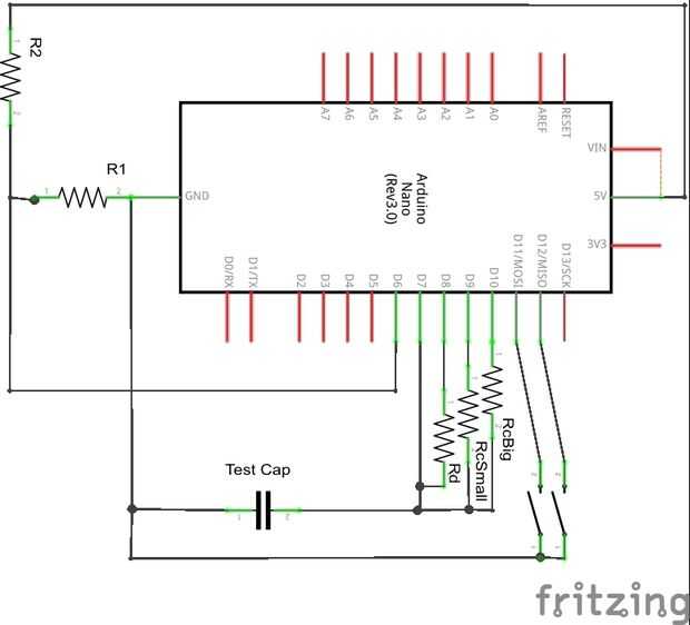 Ya que estaba bastante satisfecho con el algoritmo de medición decidí finalizar boceto mejora. En particular, quería ser capaz de trabajar con pequeñas y grandes resistencias Rc y alternar entre ellos automáticamente según el valor del condensador bajo prueba, para evitar la carga innecesaria del bosquejo. Otros cambios incluyen el ajuste automático 'capacitancia perdida' para ambos modos, mayores opciones de configuración del tablero (selección de pin, explicada en el paso siguiente) y una pantalla legible.
