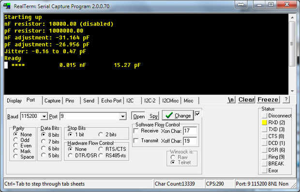 Este bosquejo toma algún tiempo para poner en marcha: calcula 'capacitancia perdida' para ambas resistencias Rc, luego pruebas jitter en grande. Este paso es necesario para asegurarse de que el ajuste era correcto; Si veo que la inquietud se inclina demasiado a – o + laterales, solo reinicio Arduino (trató de promedio esta inquietud e incluir en el ajuste de pF pero no le gustó el resultado). Es posible desactivar el modo de nF o pF si necesita conexión a tierra el pin correspondiente (11 y 12 por defecto); Esto se puede hacer tanto antes de comenzar y en el dispositivo de trabajo (puede conectar algunos interruptores). Puede ser necesario medir algunos caps muy pequeñas, como 15pF o menos, como el programa tendrá en cuenta su valor insignificante en modo normal. Interruptor automático de modo de nF (por defecto) a pF no ocurre inmediatamente evitar errores mientras que están poniendo un condensador en un banco de pruebas (algunos resultados aleatorios se generan en este proceso).