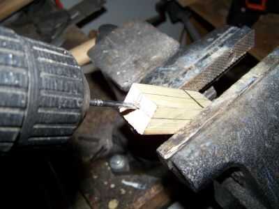 Hice las líneas guía en lápiz y perforados a mano. Porque pedacitos de este tamaño son cortos que tuve que perforar desde cada extremo hacer un agujero que recorre toda la longitud del bloque. Afortunadamente, mis agujeros se reunieron en el centro. Incluso si no se cumplen, este dispositivo seguirá funcionando, pero los agujeros deben ser por lo menos cerca de reunión.