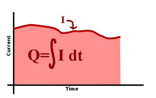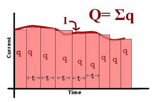 En Resumen, la corriente se mide a intervalos determinados (t pequeña), entonces se asume que la corriente era casi el mismo para el intervalo entero. Podemos calcular una pequeña porción de capacidad usada, I * t = q, para cada intervalo, entonces simplemente se suman todas las cargas poco a Q, la capacidad real de la célula (Q = Σq). (Sigma, Σ, significa todo lo sume). En el cuadro de suma de Riemann (con todas las líneas verticales), a veces el q es un poco grande, y a veces es un poco pequeña. La idea de una suma de Riemann es que los errores positivos se cancelan los errores negativos y todo elimina bastante cerca.
