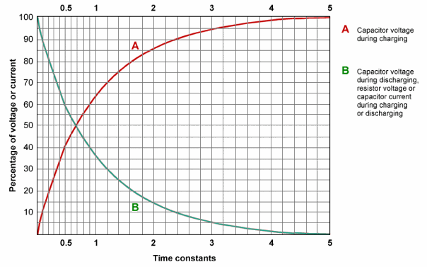 Tau puede simplificarse a partir de una ecuación más complicada (ver imágenes arriba) para representar el tiempo que tarda un condensador en cargarse, a través de una resistencia, para alcanzar el 63,2% de su voltaje total. Esto se puede también medir por el tiempo que toma el condensador a 36.8% de su voltaje total en descarga.