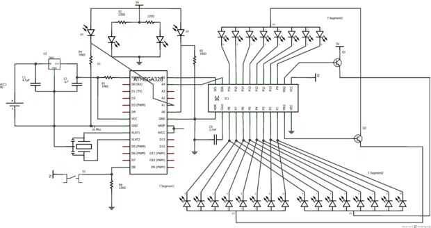 Cuando un dardo pasa la barrera de luz IR-LED de bloqueo de la corriente cae instantáneamente a cero. En este momento el microcontrolador empieza a contar los microsegundos hasta que se bloquea el segundo LED. Como sabemos la distancia entre los LEDs podemos calcular la velocidad del dardo.