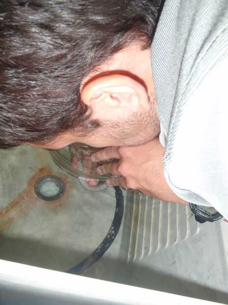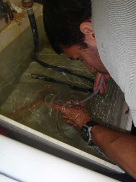 4. Coloque un extremo del tubo sobre el agua para poner la boca. Coloque el otro extremo del tubo en la abertura del contenedor.