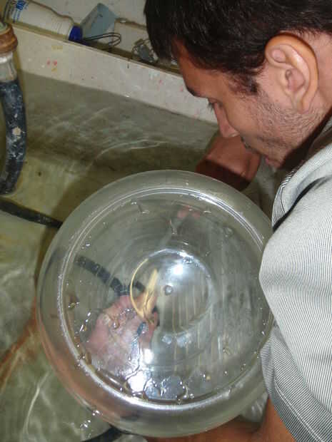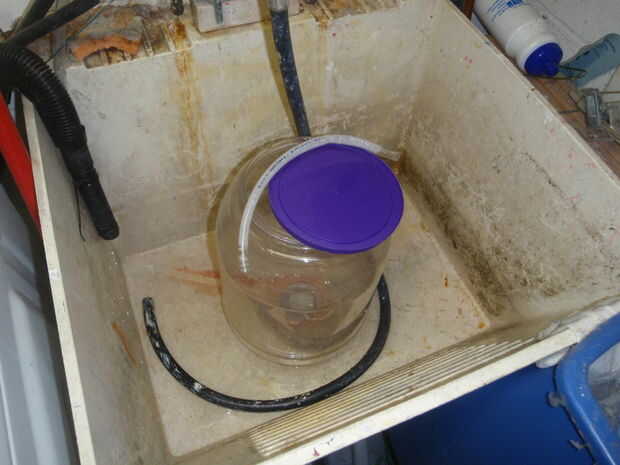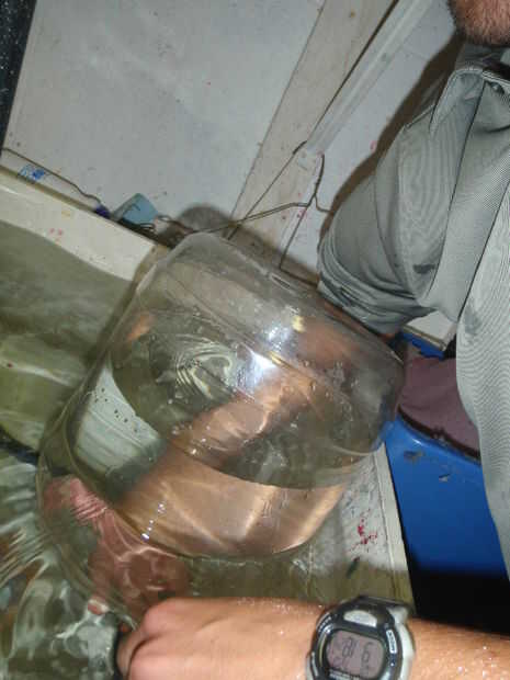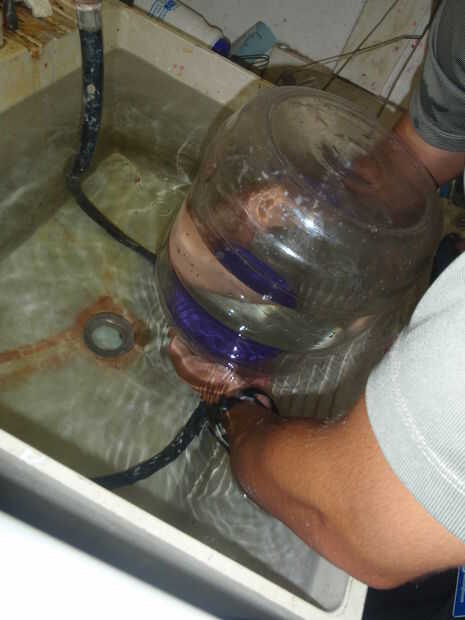 3. voltear el recipiente para que la abertura quede hacia en el agua. Si no puede salir burbujas de aire terco pasados utilice el tubo de aspirar hacia fuera.