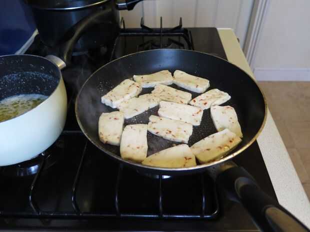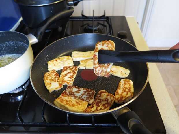 Primero apagado quiere el halloumi y su pan de pita frito primero, estos pueden ser mantenidos calientes fácilmente y no como otras partes de este plato no ser arruinadas si enfríe y necesita ser nuevamente calentado.