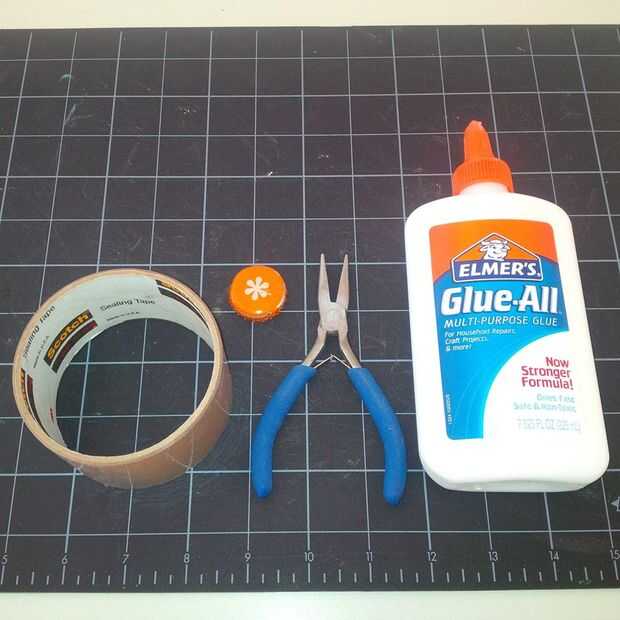 Necesitará pegamento que seca claro, pinzas y tapa de la botella. La cinta no es necesaria, que simplemente creo que facilita las cosas.