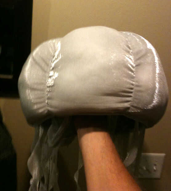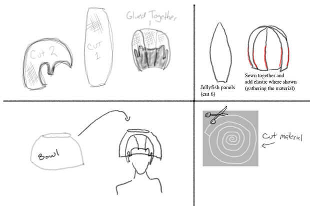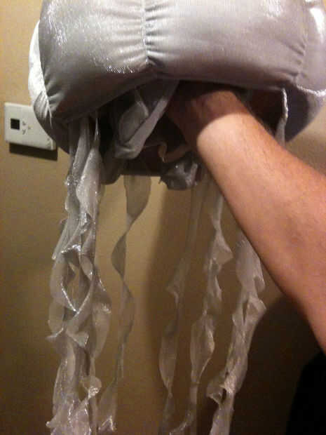 A continuación pinté un recipiente de plástico grande todo blanco por lo que sería el color base de la medusa. A continuación cortar el material en la forma del dibujo, para caber más grande que el recipiente porque sabía que quería que soplo hacia fuera de la taza y ver "gordita" por lo que sería más teatral buscar. Cosí las piezas juntas, pequeño termina en el centro, luego agregó elástico en los lados para recoger de los centros de la sección hinchada así protruir. colocarla en el recipiente y empellones de relleno en el medio para agregar el soplo. Luego pegar la taza para la pieza del sombrero.