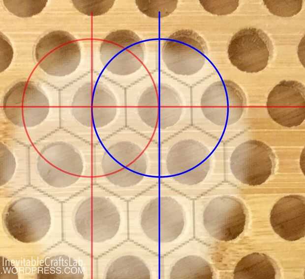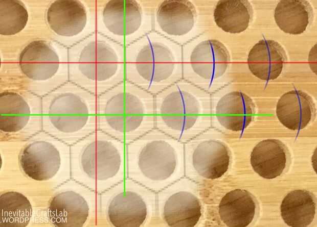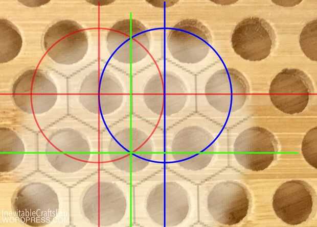 Depende fuertemente de bolas de diámetro, tomé distancia de 17mm (círculo rojo), ya que tengo planes adicionales con este y adafruit LEDs RGB. Y elegí a 12mm de diámetro de los agujeros.