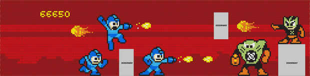 En la escena, tengo nuestro héroe Mega Man se muestra en tres fases de un salto de corriente sobre una puerta, su cañón de brazo de voladura a mal dos "jefes" en el otro extremo de la pared. Solía los diversos portales como obstáculos o plataformas para los caracteres soporte – o salto largo. La escena larga acción llena la pared y crea opiniones interesantes en todo el espacio. Yo incluso alineado uno de los jefes a ser visible desde una ventana del segundo piso de la oficina.