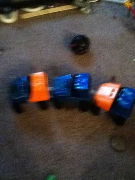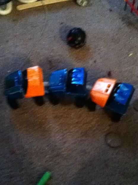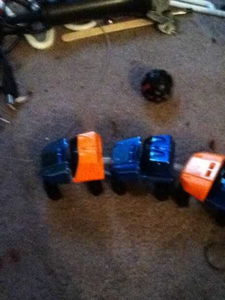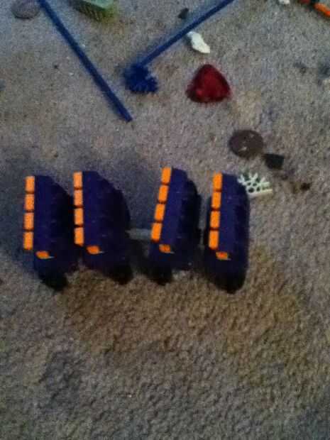 Tomar tres coches mini y conectar ellos todos juntos y la pieza que agarra la cadena, desconecte que de todos los coches excepto el coche de puño. Ahora tormenta caída libre coaster coches y conéctelos y retire la misma pieza.