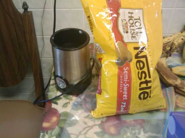 - 1, bolsa de 72 oz de chocolate semi-dulce (utilicé trocitos de chocolate, pero pueden utilizarse barras de chocolate * como es semi-dulce *; es más conveniente derretir los chips de chocolate)