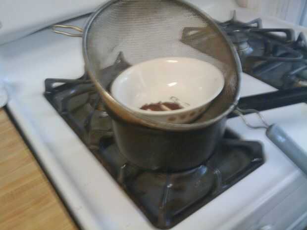 Para mi caldera doble, usé una jarra llenado de agua, un tazón de cerámica y un colador en el recipiente para evitar que chapotear alrededor en el agua.