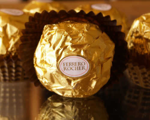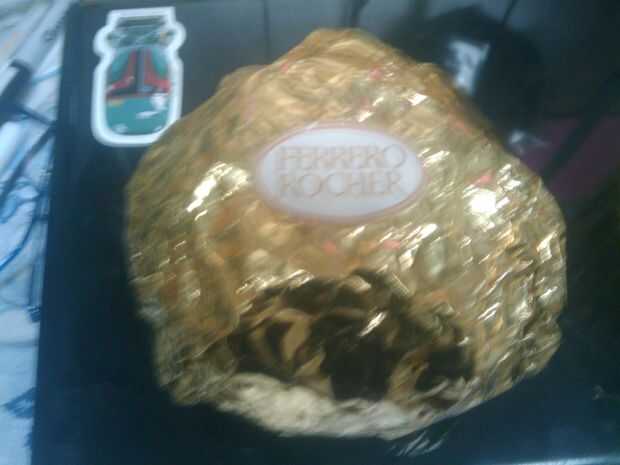 No tuvo tiempo de hacer gran versión de las tazas de papel, así que imprimí sólo versiones agrandadas del logotipo del Ferrero Rocher en papel de pegatina (y poner en 3 capas de esmalte de uñas transparente para darle un brillante acabado), arrugado encima de papel de regalo oro, encubrieron el Mega Rocher con el abrigo de regalo arrugado, con cinta para evitar que deshaga y pegado el logo.