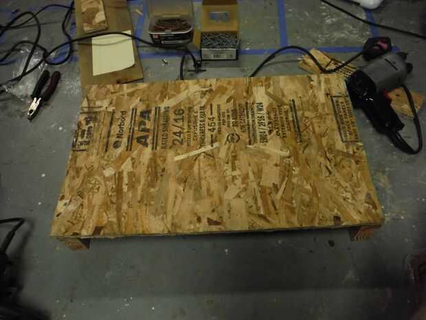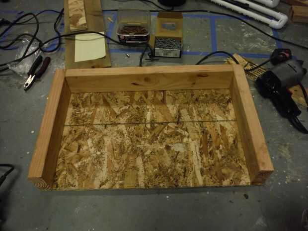Vamos a empezar con la construcción de una base para la nevera en. Empieza por tomar la 23" 2 x 4 y 2 16" 2x4s y atorníllelos con 3" tornillos como se ve en la primera imagen. Utilice 2 tornillos para cada articulación. Una vez que hayas hecho esto, coloque el 16" 26" pedazo de madera contrachapada en la parte superior la forma de "C" que acaba de hacer. Fíjelo con 3 tornillos uniformemente espaciados de 1 5/8 de pulgada en cada uno de los lados cortos y 4 tornillos en el lado largo. Ahora debe tener la base que se muestra en la tercera imagen.