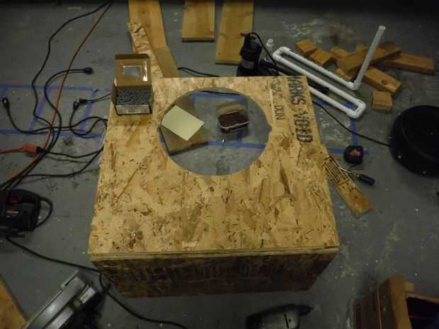 Ahora usted necesita cortar un agujero frente a la nevera (que no está conectada todavía) para insertar su ventilador en. En primer lugar, tomar el ventilador y colocarlo de manera que quede centrado horizontalmente y el borde del ventilador 2" debajo de la parte superior de la base (los lados 26" será horizontales). Ahora traza el borde de su ventilador con un lápiz. Ahora, use un taladro 1" broca para perforar un agujero en algún lugar dentro del área que usted necesita para cortar. Usando una sierra de calar, empezar a cortar el agujero que ha perforado, cortando hasta el borde del agujero del ventilador primero corte el borde alrededor de todo el camino. Asegúrese de apoyar la sección a cortar una vez que usted consigue a la última pocas pulgadas, pero asegúrese de que su brazo de apoyo no está en el camino de la sierra. Eso sería malo.