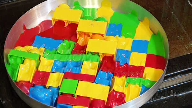 2. precalentar el horno a 260° F. La temperatura de fusión de polietileno puro de alta densidad es 300° F. Comencé en la gama más baja y levantó el calor a 300° F durante un período de 2 horas. Comprobación de los bloques, es probable que empezar a fundirse antes el horno a 300° F. Esto es porque la temperatura del horno es probablemente cercano pero no exacto.