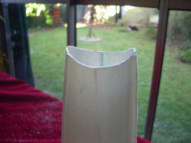 La embocadura tiene adaptarse a la boca de uno, para la voz se aplique en su totalidad a la bocina. Como esta tiene un tronco relativamente grueso, solo tuve hacer dos cortes chanfleados para adopte la forma semicircular de la boca. Si hubiera sido de diámetro más chico, tendría que haber hecho una embocadura con un recipiente plástico cubra la boca, y adherirla al tronco de la bocina.