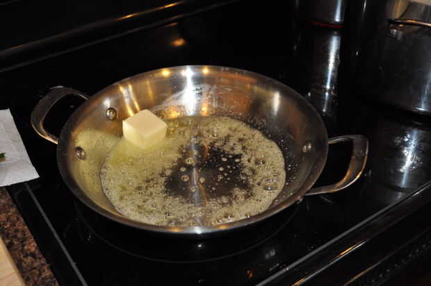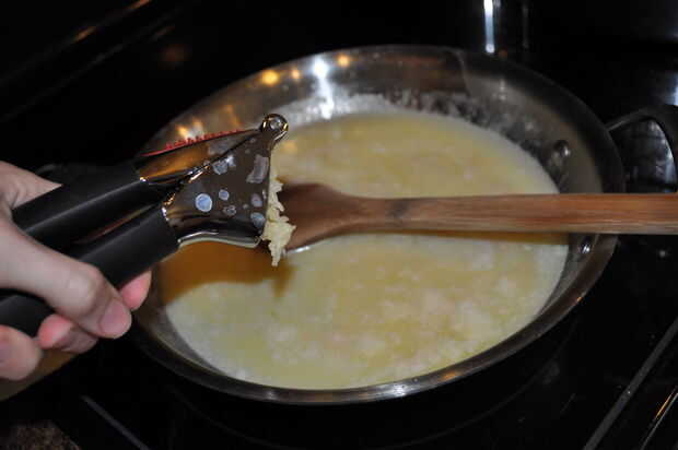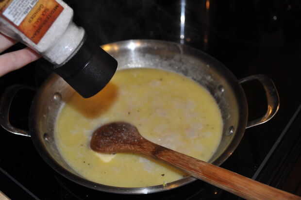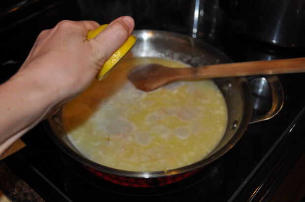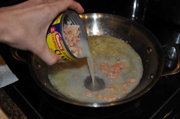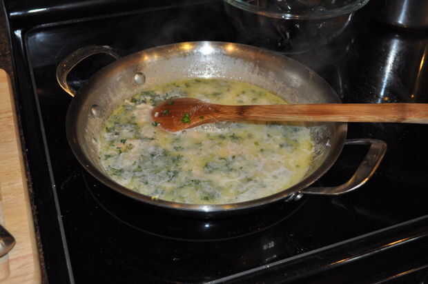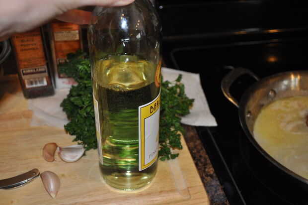 Melt 1 cube butter in sauce pan. Añadir: 1 lata de almejas y de jugo blanco de 1/3 botella vino Jugo de un limón 2 dientes de ajo, picadas 1/4 taza de perejil fresco Sal y pimienta al gusto