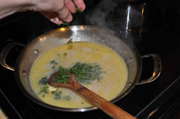 Dejar hierva a fuego lento mientras se cocinan los mejillones.