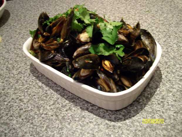 Sirvo en un bol grande para dos personas a compartir; es ideal para quedarte con las manos y sacar con pala encima de la salsa del recipiente con las cáscaras.