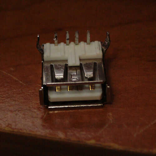 A continuación utilizar un pedazo fresco de la trenza de desoldar o una bombilla desoldadora para eliminar las grandes patas que sujetan el conector usb al tablero. Usted también necesitará doblar las piernas hacia afuera, sólo un poco.