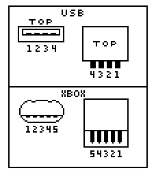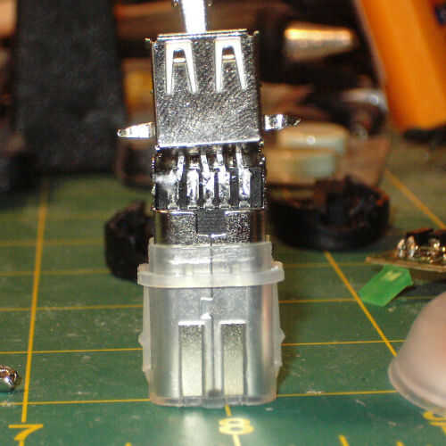 en primer lugar, la curva todos los cuatro pines en el conector USB al frente hacia afuera desde la parte posterior del conector. mirando hacia abajo desde la parte superior, dobla la izquierda pin más ligeramente a la izquierda y los otros tres pernos ligeramente a la derecha, para hacer espacio para el perno no utilizado.